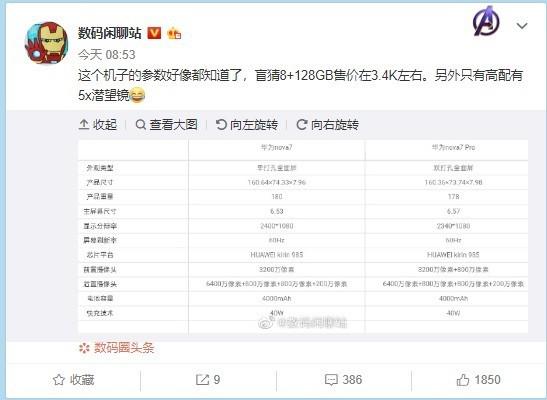 4月23日华为nova7系列即将正式发布,而在此前,关于这款新机的爆料消息却是不少。就在今天,博主 @数码闲聊站 再度放出了nova7/Pro的配置参数信息,并且表示“盲猜8+128GB售价在3.4K左右”,并且提到高配版有5倍潜望式镜头。