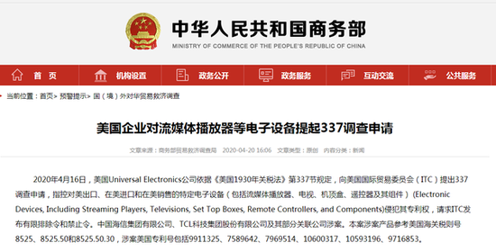 美国企业对流媒体播放器等电子设备提起337调查申请
