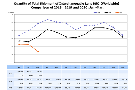CIPA的全称是日本国际相机影像器材工业协会。其以谋求进一步发展为目的而进行调查研究、信息交换活动。本工业协会以为会员发展作出贡献为目的。而近日CIPA发布了2020年3月相机销量的统计。图中橙色为2020年数值,黑色为2019年数值,而蓝色为2018年数值。