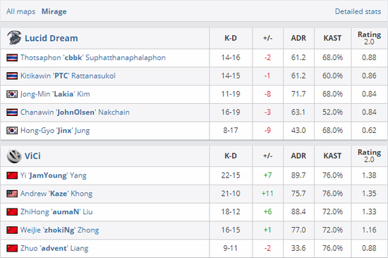 在今天的首场比赛中,VG展现出了训练许久的成果,来到对手选择的Mirage后多次通过爆弹及双人配合对A区和中路进行突破。关键局更是掏出战术提速围攻,手感极佳的Kaze和JamYoung也非纷纷发挥刷屏对手帮助队伍扩大优势,不过在应对Lucid Dream非常规反清时VG还是略有失误不过也无伤大雅。攻守互换后Lucid Dream队员的枪法也出现了一定程度的失误,仅有JohnOlsen一人发挥独木难支很快输掉了首张地图。