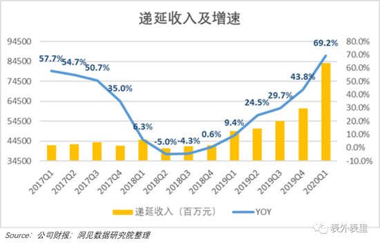 2020Q1,腾讯递延收入达到837.2亿元,同比增长69.2%,是13个季度以来的增长最高值。