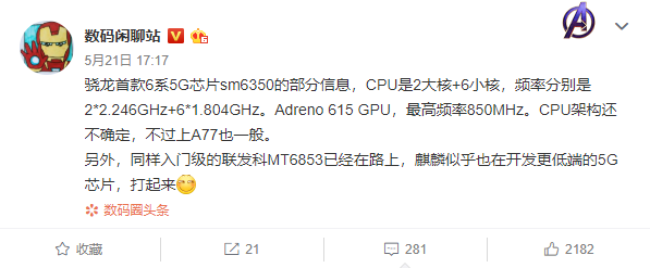 骁龙6系5G芯片sm6350曝光 定位入门主频2.246GHz