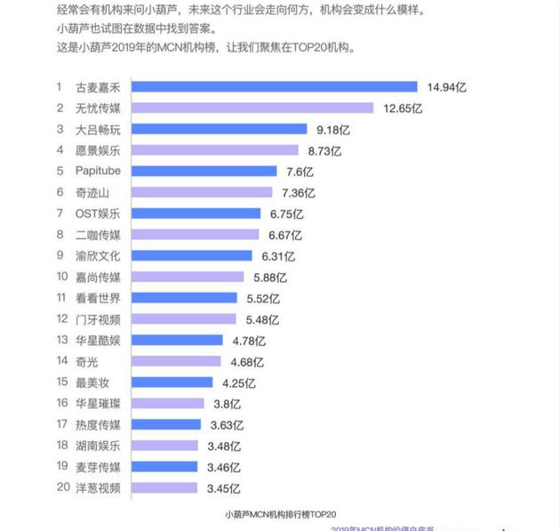2019年MCN机构排行榜中排名较高的几家公司,无忧传媒、古麦嘉禾、二咖传媒等旗下均有几十位出名的网红。无忧传媒的多余和毛毛姐、二咖传媒旗下的东北人(酱)在洛杉矶等全网粉丝均为几千万。