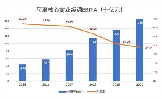 2018年以来,阿里核心商业利润率累计下降23.8个百分点,但绝对金额仍以20%左右的速度增长。