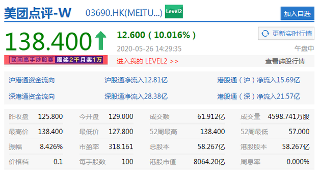 5月26日下午消息,美团点评涨幅超过10%,截至发稿,美团点评涨10.016%报138.400港元,港股市值达8064.20亿港元。