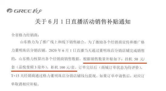 然而,今天有媒体报道,格力各地门店早在此次直播前两天出台补贴通知,商家在董明珠的店购买空调,每台挂机给予50元,柜机给予100元补贴。