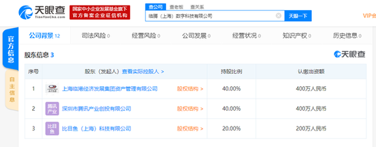 天眼查股东信息显示, 上海临港经济发展集团资产管理有限公司和深圳市腾讯产业创投有限公司分别持有该公司40%的股份,为公司最大股东;比目鱼(上海)科技有限公司持股20%,为公司第二大股东。