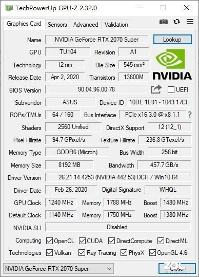 ROG枪神4Plus还搭载了一块满血版本的RTX2070 Super 拥有2560个流处理器,8GB显存,基准频率1240Mhz,Boost频率1480Mhz,TGP115W。