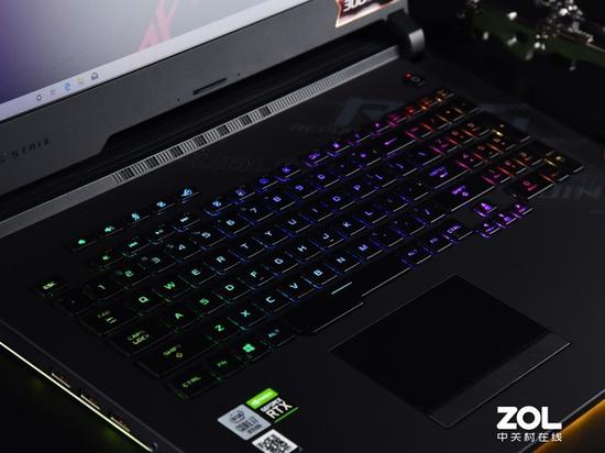 ROG枪神4Plus拥有一块单键可编辑的RGB背光键盘,键程1.8mm,回弹和响应都很迅速。键盘上方有5个独立的功能按键,分别为音量加减、麦克风开关、增强模式开关和奥创中心按键。键盘带有小键盘区域,但是作为17.3寸屏幕的游戏本来说,方向键过于小了,目测只有其他按键三分之一的大小,可能是为了键盘观感的整体性而做了妥协。