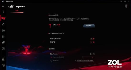 相信ROG的粉丝们对Keystone已经非常熟悉了,这是在高端ROG型号中才有的一个功能,插入Keystone,系统自动弹出奥创中心,绑定成功后玩家可以解锁一个ShadowDrive隐藏空间,这部分空间与系统空间共享,但是只有在插入Keystone后才会显示。另外,玩家还可以在Keystone中保存一套自己的奥创中心设置,可设置插入后启动游戏、RGB灯效切换、模式切换等等。