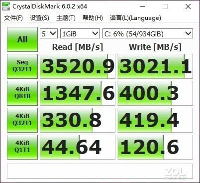 在硬盘方面,枪神4Plus配有一块1TBNVMe PCIe3.0固态硬盘,来自三星,型号为MZVLB1T0HBLR-00000,并且预留了2个M.2SSD插槽,这三个M.2插槽中有两个支持组建RAID0。通过CrystalDiskMark对这块1TB的固态硬盘进行测试,最大读取3520MB/S,最大写入3021MB/S,性能上乘,均突破3000MB大关。