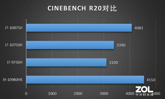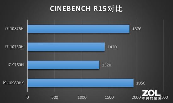 可以看到,不管是CINEBENCH R15环境下还是CINEBENCH R20环境下,i7-10875H都远超其他两个i7处理器,与移动端的超旗舰处理器i9-10980HK相差也已经不大。