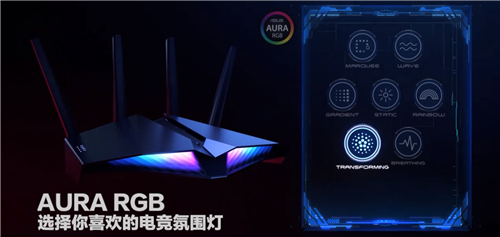 魔鬼鱼复眼被设计成7种幻彩AURA RGB特效,会按照需要,根据不同使用和工作方式进行切换,呈现出满满的电竞炫酷风。竞氛围灯效可以通过软件进行调节,让电竞路由一秒变拉风。