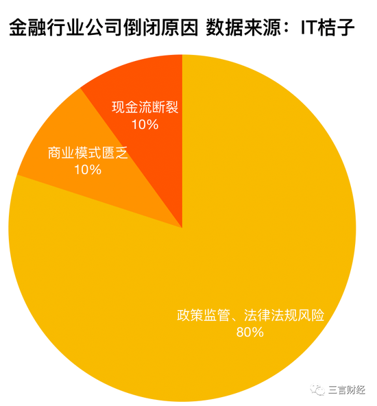 根据行业来看,金融行业公司倒闭原因中,80%因政策监管、法律法规风险导致公司关闭。