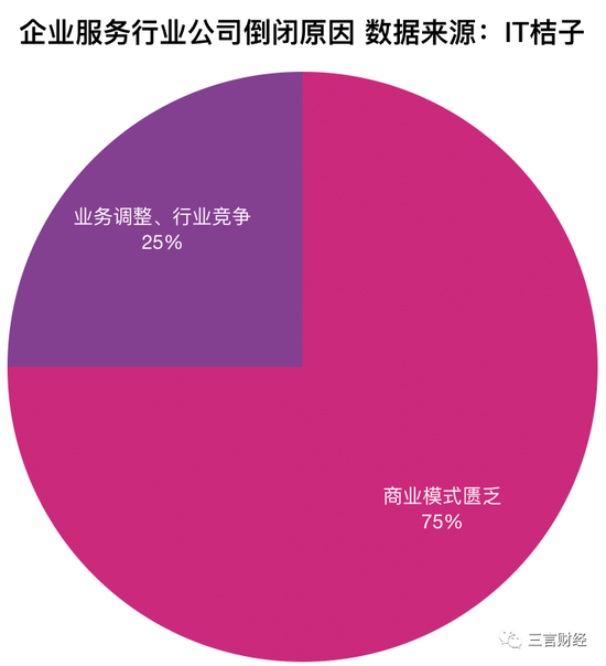 企业服务行业中,有75%的公司倒闭原因和商业模式匮乏有关;25%的公司倒闭涉及业务调整、行业竞争等因素。