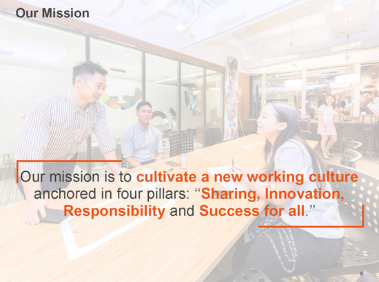 △ 优客工场希望培养一个以“分享、创新、负责、让每个人成功”四大理念为基础的新工作文化。