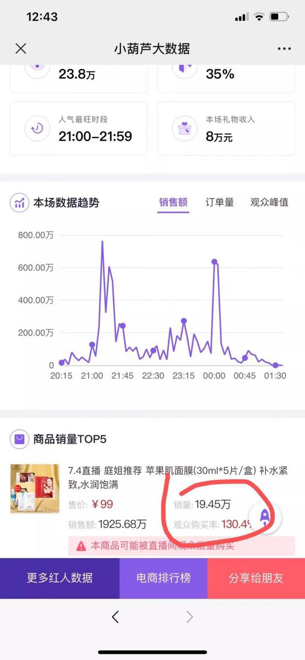 第三方数据平台小葫芦大数据监测显示,艺人张庭在7月4日的一场直播中,其销售的一款面膜观众购买率达到了130.4%。这一数据存在刷单造假的嫌疑,因此被系统外显提示为“数据异常,本商品可能被直播间观众批量购买。”