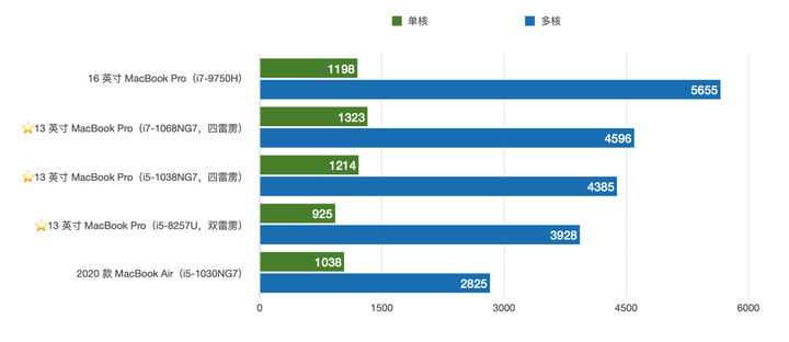 ▲我们此前测试的 GeekBench 5 单核、多核性能对比数据(星号为新机型,i5 双雷雳、四雷雳版本跑分为 Max Tech 数据)