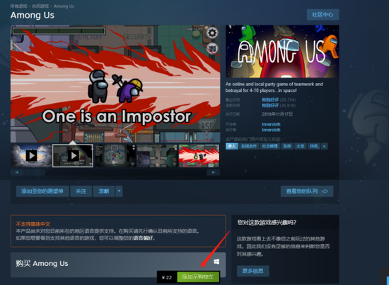 近期Steam平台非常火热的一款游戏《Among us》已成功挤入Steam排行榜前三,和糖豆人不相上下,本作是一款以太空为背景的狼人杀多人游戏,支持线上联机,不支持中文。作为一匹黑马,本作近期吸引很多新手玩家入坑,但很多玩家不知道怎么购买下载,笔者整理一篇如何购买下载图文教程,具体内容如下: