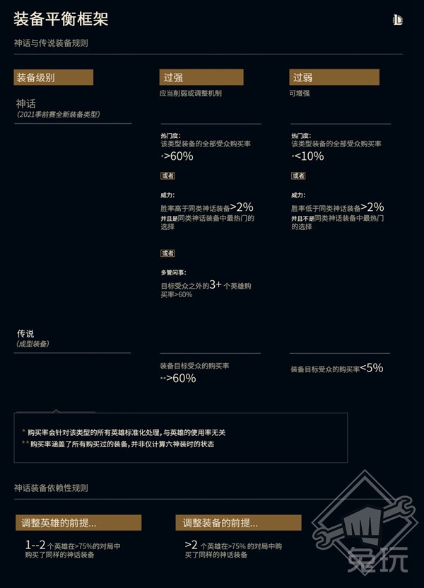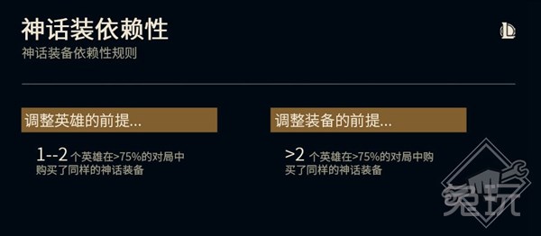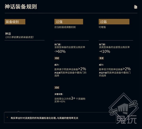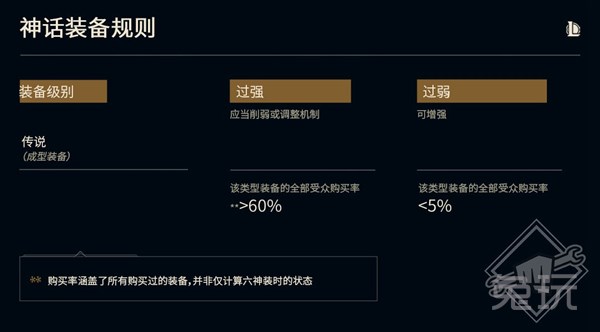 ● 任何英雄使用某一神话装备的胜率不能>其他选择的6%:某件装备的威力过于突出很可能会抑制选择的空间,哪怕它目前没有违反其他的规则